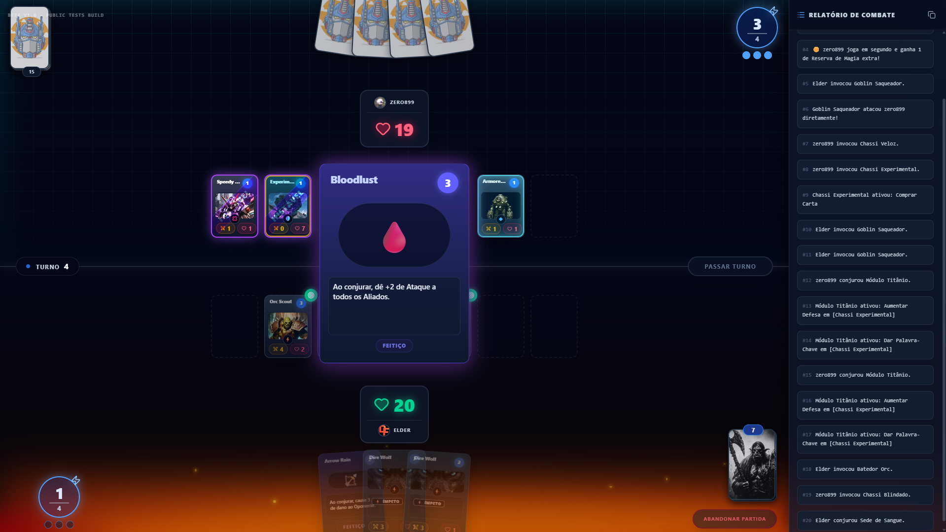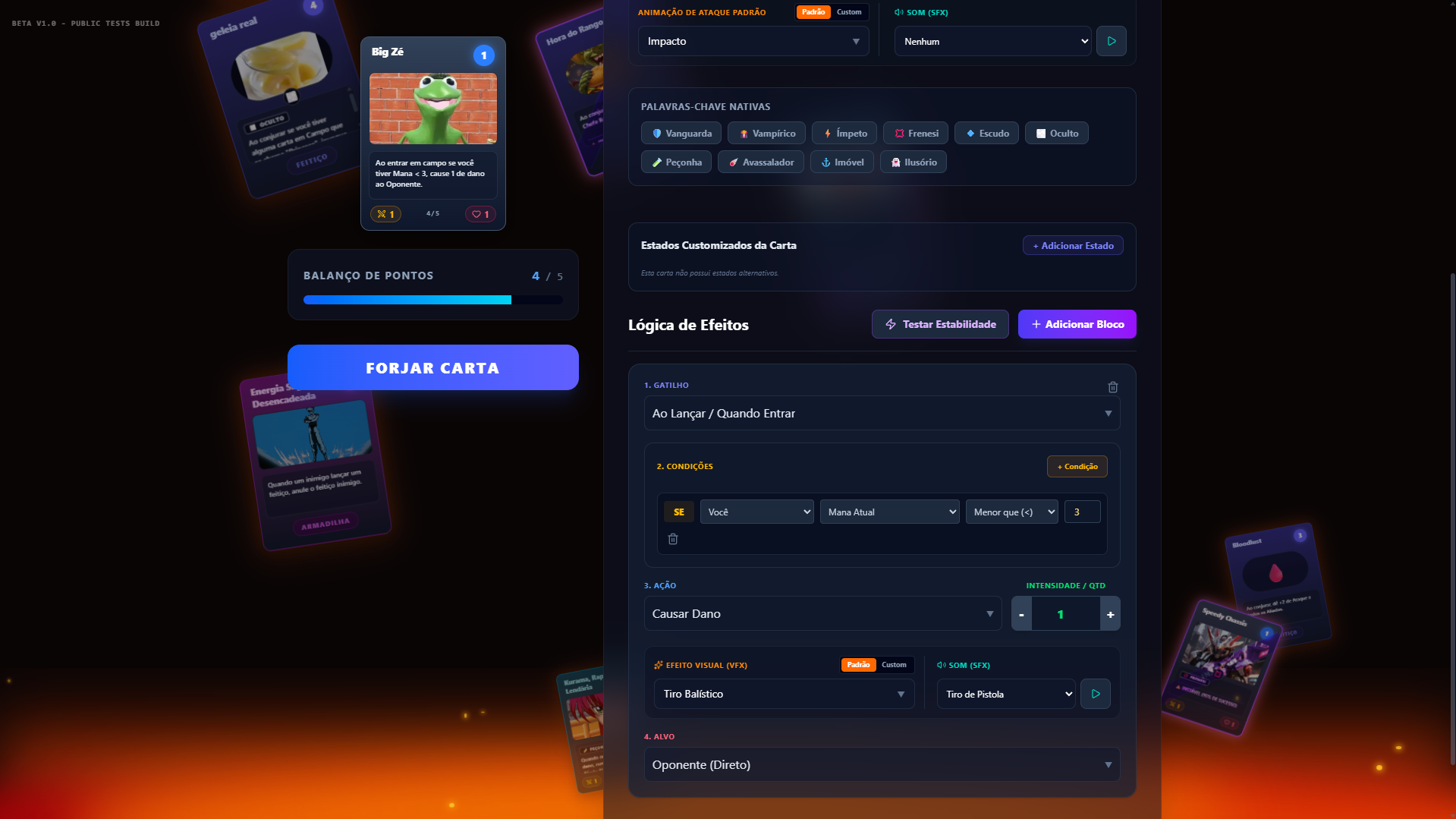 🛠️ O Verdadeiro Card Builder: Esqueça cartas pré-fabricadas. Na Forja, você define o custo de mana, ataque, vida, artes personalizadas e adiciona palavras-chave poderosas como Vanguarda, Ímpeto ou Peçonha. Você dita o meta do jogo.